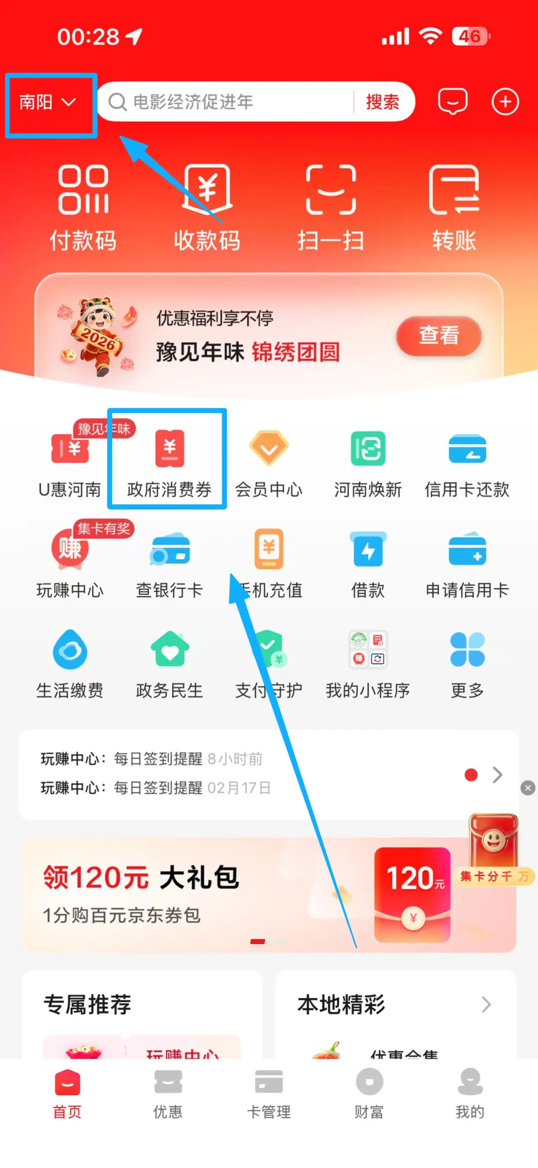 ✅参与流程:进入云闪付根据下述图示即可进入入口(注意云闪付地址要选择南阳才可以进入界面)