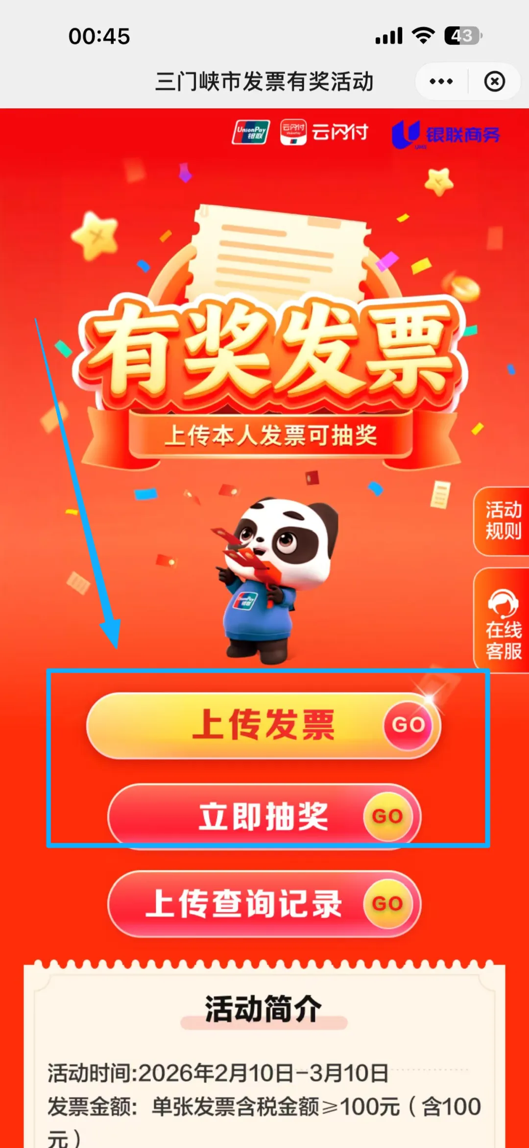 点击上传发票即可上传符合活动要求的发票,上传过后点击【立即抽奖】,即可进行参与抽奖