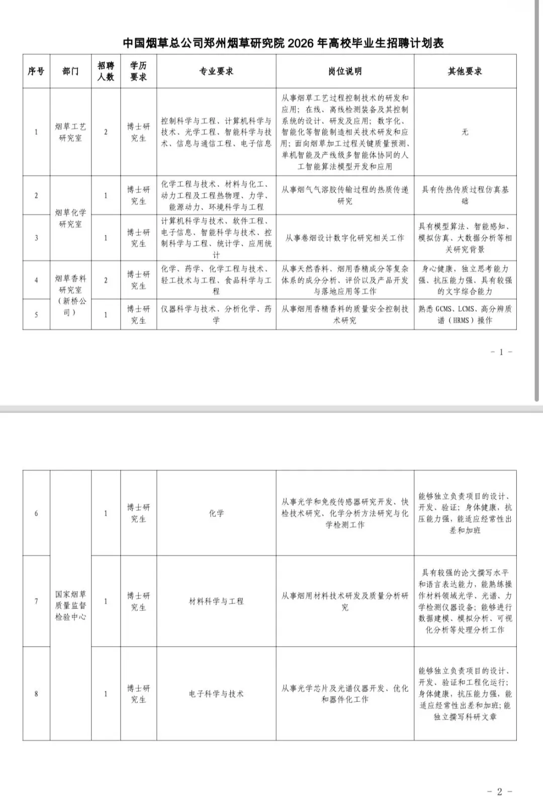 附件1:中国烟草总公司郑州烟草研究院2026年高校毕业生招聘计划表.pdf