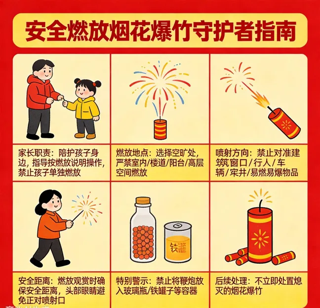 燃放烟花爆竹时,家长应陪护在孩子身边,指导孩子按照燃放说明进行燃放,不得让孩子独自燃放烟花爆竹。