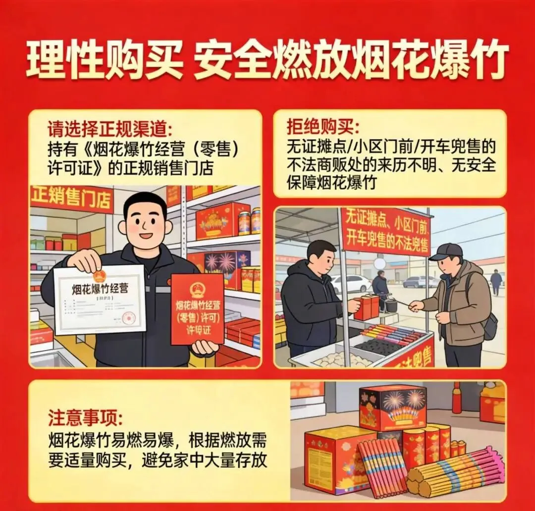 购买烟花爆竹时,请到持有《烟花爆竹经营(零售)许可证》的正规销售门店购买,不在无证摊点、小区门前、开车兜售的不法商贩处,购买来历不明、无安全保障的烟花爆竹。