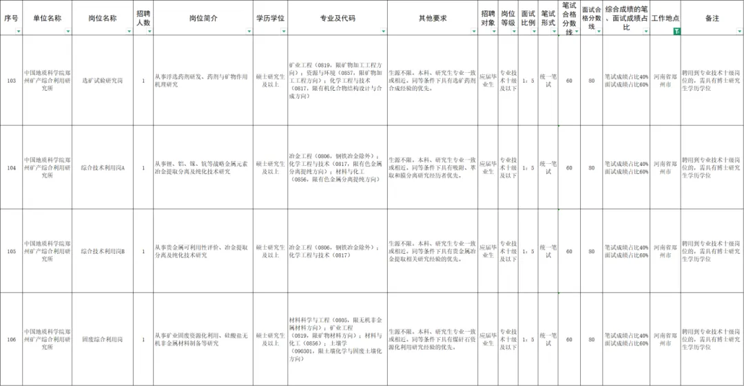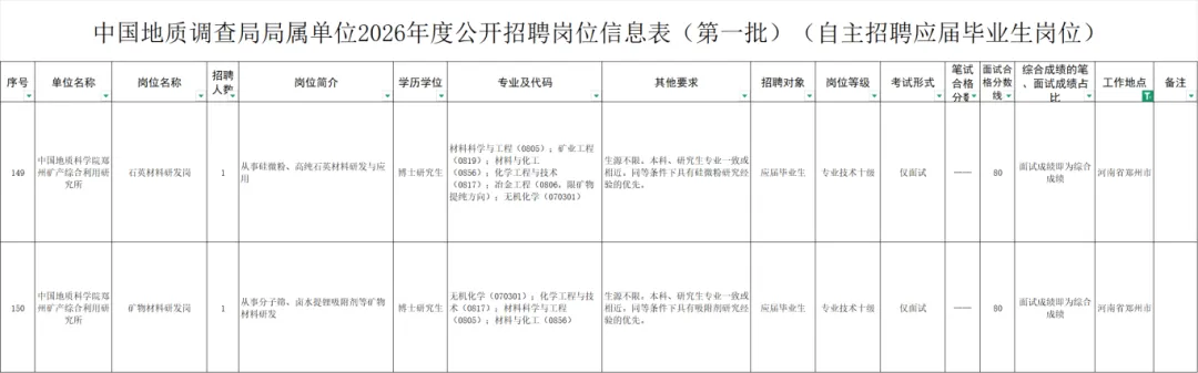 具体招聘岗位见《中国地质调查局局属单位2026年度公开招聘岗位信息表(第一批)》(见附件1-4)。中国地质调查局局属在京单位京外生源岗位不参加本批次招聘。