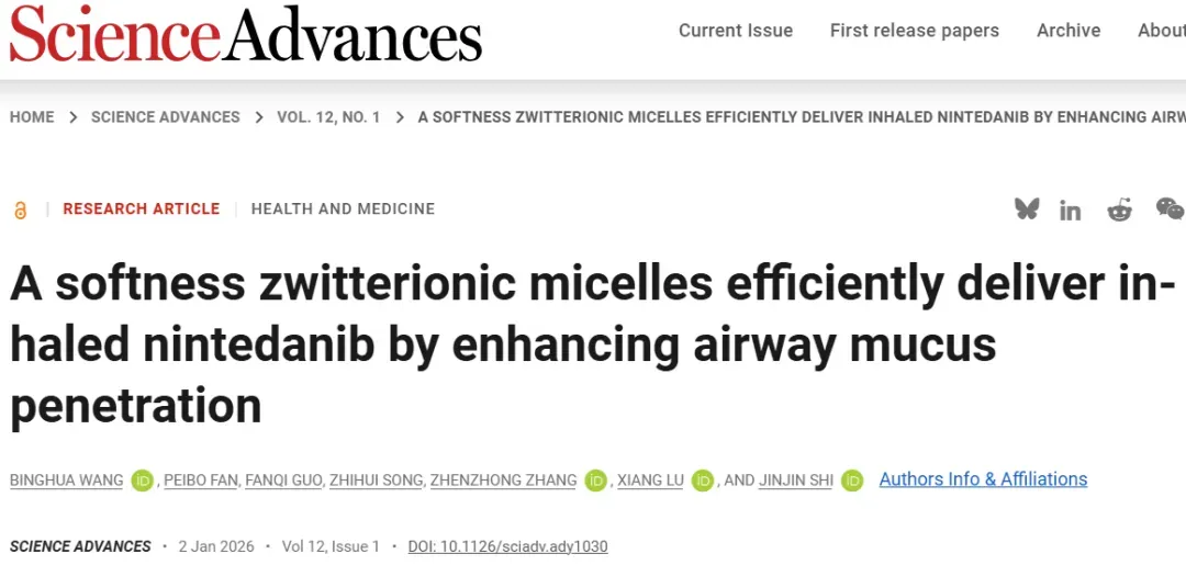 Binghua Wang et al., A softness zwitterionic micelles efficiently deliver inhaled nintedanib by enhancing airway mucus penetration. Sci. Adv.12, eady1030(2026). DOI:10.1126/sciadv.ady1030