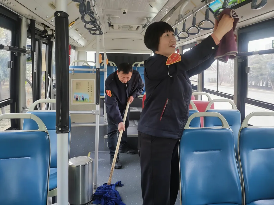 接过丈夫手中的方向盘,李新春迅速进入工作状态。自成为公交驾驶员以来,她始终秉持着“热情服务、用心待客”的初心,将女性的细心与温柔融入到每一次运营中。尽管丈夫已经仔细打扫过车厢,她还是会再次检查,用抹布擦拭座椅缝隙、扶手栏杆,清理地面的细小杂物,让车厢始终保持干净整洁。“春运路上,大家赶路都辛苦,一个干净舒适的乘车环境,能让大家心里暖乎乎的。”