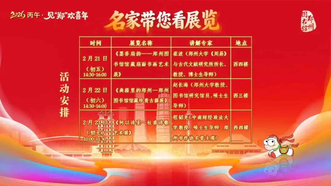 为了让展览不止于“看”,春节期间,郑州图书馆特别策划 “名家带您看展览”公益导赏活动。三位长期深耕文献、文学与文化研究的学者,将在展厅中与读者面对面,从专业视角出发,用通俗而生动的方式,带大家走进展览背后的知识与故事。