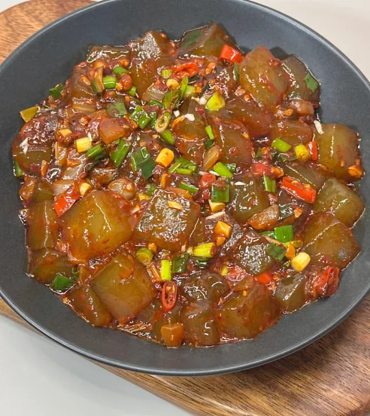 最画龙点睛的是最后浇上的酱汁——用老抽、料酒、糖和多种香料熬制,浓稠红亮,甜咸适中。上桌前撒上葱丝、红椒丝,色香味俱全。