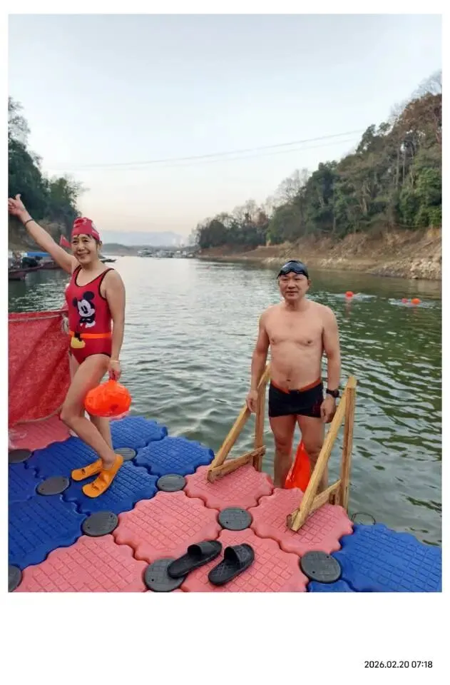 郑州泳友们漫步陆水湖畔,沉醉于一湖碧水的灵秀,赞叹赤壁冬泳人扎根本土、深耕公益的初心。大家换上泳装,纵身跃入清冽的湖水之中,以矫健的身姿劈波斩浪,在寒冬碧波中舒展活力,用冬泳人独有的方式传递新春祝福、凝聚泳友情谊。冰冷的湖水挡不住滚烫的热爱,岸边欢声笑语不断,水中逐浪身影矫健,两地泳友以水为媒,畅聊冬泳技巧、分享运动心得、交流救援经验,尽显“天下泳友一家亲”的真挚情怀。