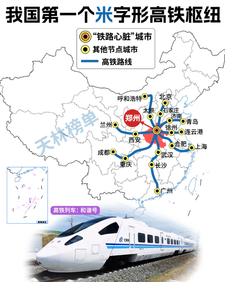 郑州东站位于中国经济地理的中心位置,是京广高铁与徐兰高铁的十字形交汇点,同时衔接郑渝高铁、郑阜高铁、郑太高铁、郑济高铁等放射性线路,是全国唯一的米字形高铁枢纽车站。