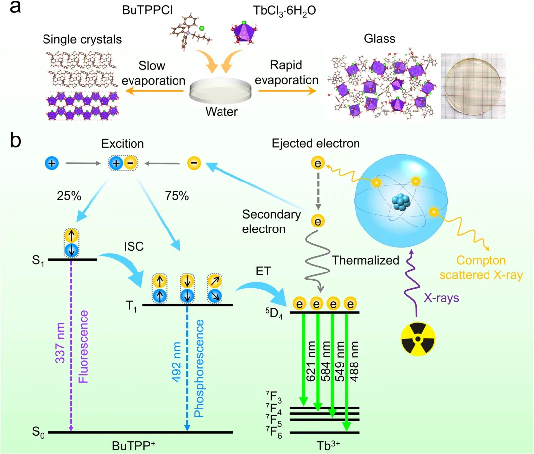 图1 a) 通过水辅助快速蒸发法可控合成(BuTPP)3TbCl6玻璃的示意图。当溶剂缓慢蒸发时,BuTPPCl·水和TbCl3·6H2O将分别结晶。左侧显示BuTPPCl·水和TbCl3·6H2O晶体的晶体结构,右侧显示合成的直径为6厘米的(BuTPP)3TbCl6玻璃的无定形分子结构及照片。b) 闪烁机制的示意图,重点展示了有机阳离子BuTPP+向Tb3+离子的三重态激子介导的能量转移。