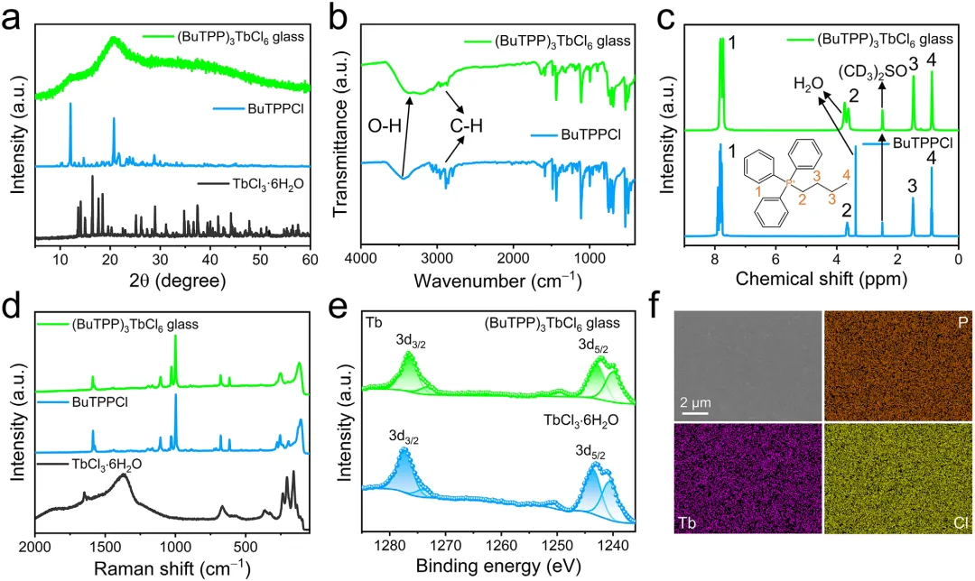 图2 a)(BuTPP)3TbCl6玻璃、BuTPPCl及TbCl3·6H2O前驱体的 PXRD 谱图。b)(BuTPP)3TbCl6玻璃与BuTPPCl前驱体的 FTIR 谱图。c)(BuTPP)3TbCl6玻璃与BuTPPCl前驱体的1H核磁共振谱图。d)(BuTPP)3TbCl6玻璃、BuTPPCl及TbCl3·6H2O前驱体的拉曼光谱。e)(BuTPP)3TbCl6玻璃与TbCl3·6H2O前驱体中Tb3d的高分辨 XPS 谱图。f)(BuTPP)3TbCl6玻璃中P、Tb和Cl的SEM图像及EDS元素分布图。