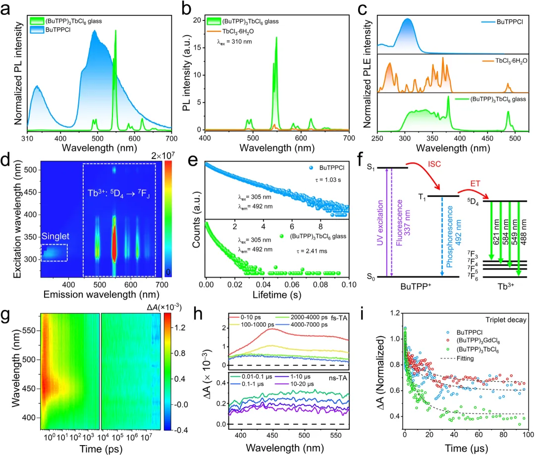图3 a) (BuTPP)3TbCl6玻璃与BuTPPCl分子的光致发光光谱。b) (BuTPP)3TbCl6玻璃与TbCl3·6H2O前驱体的光致发光光谱。(c) (BuTPP)3TbCl6玻璃、BuTPPCl及TbCl3·6H2O前驱体的光致发光发射光谱。(d) (BuTPP)3TbCl6玻璃在室温下的二维激发-发射矩阵光谱。(e) BuTPPCl分子与(BuTPP)3TbCl6玻璃的时间分辨光致发光衰减光谱。(f) (BuTPP)3TbCl6玻璃中光致发光过程的光物理机制。(g) (BuTPP)3GdCl6玻璃的飞秒热分析与纳秒热分析光谱二维等高线图。(h) 300 nm激发后热分析光谱的演变过程。(i) BuTPPCl、(BuTPP)3GdCl6与(BuTPP)3TbCl6在10纳秒延迟后的三重态衰减动力学对比。
