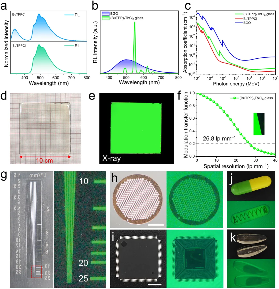 图4. a) BuTPPCl的PL与RL光谱。b) (BuTPP)3TbCl6玻璃与商用 BGO 闪烁体的RL光谱。c) (BuTPP)3TbCl6、BuTPPCl及商用 BGO 闪烁体的X射线吸收系数随光子能量变化曲线。d) 常规光照下与e) X射线辐照下(BuTPP)3TbCl6玻璃闪烁屏的显影照片。f) 采用斜边法测得的(BuTPP)3TbCl6玻璃闪烁屏MTF曲线,插图显示带锐边的铅片X射线图像。g) 使用(BuTPP)3TbCl6玻璃作为闪烁屏的标准25线对卡的显影照片(左)与X射线图像(右)。h) 内径20 μm 的铜网(比例尺1 mm)显影照片与X射线图像;i) 电子芯片(比例尺5 mm)显影照片;j) 含金属弹簧的胶囊显影照片;k) 使用(BuTPP)3TbCl6玻璃闪烁屏的两颗向日葵籽显影照片。