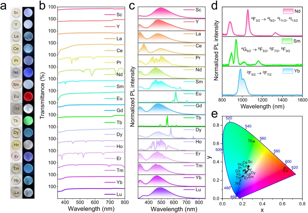 图5. a) 常规光照与365 nm紫外光照射下直径16 mm的杂化镧系金属卤化物玻璃的显微照片。b) 300 nm紫外激发下杂化镧系金属卤化物玻璃的透射光谱与光致发光光谱。c) (BuTPP)3LnCl6(Ln = Nd,Sm,Yb)玻璃的近红外光致发光光谱。e) 300 nm紫外激发下杂化镧系金属卤化物玻璃的CIE色度坐标图。