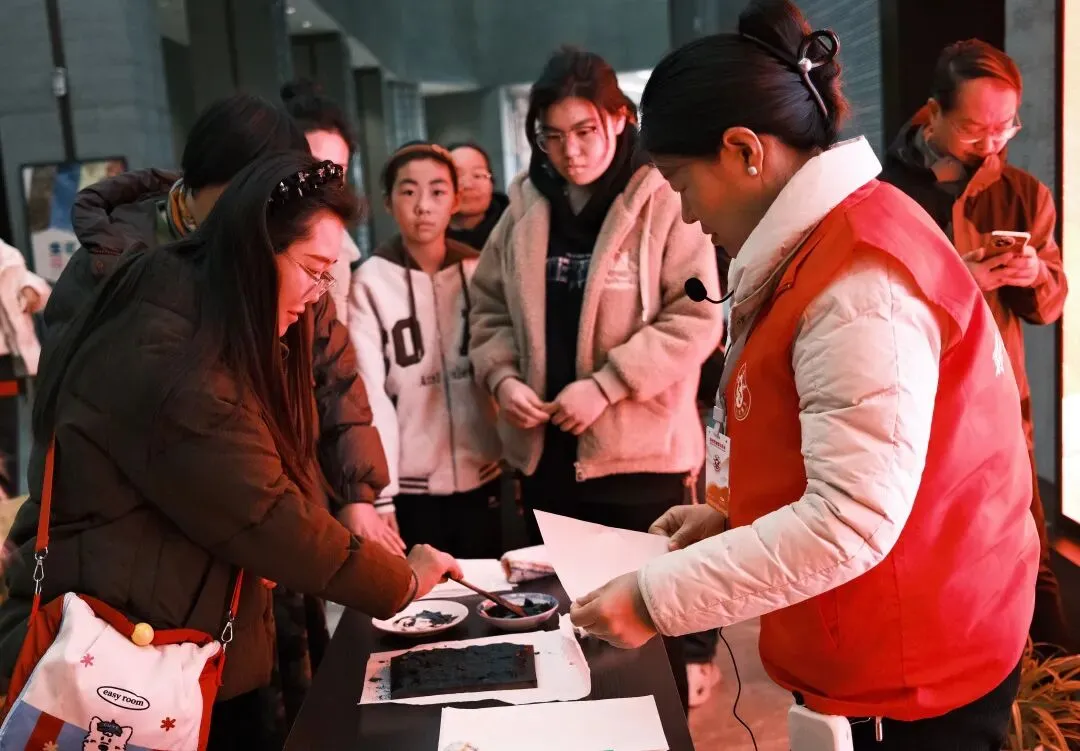 来自江西上饶的龚女士一家赶到博物馆,看到正在进行非遗拓印体验,兴致勃勃地加入了排队。“我和儿子都是属马的,能在新年在这里拓印一张‘福马’,感觉很有意义。”龚女士一边说一边和儿子蘸墨。他们拿到印好的成品,一匹昂首跃蹄的骏马,一家人高兴地欣赏着,在大屏幕前合影留念。