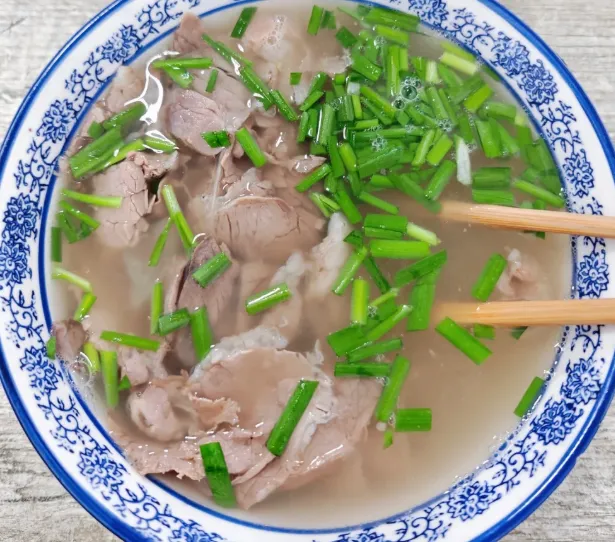 南阳牛肉汤做法速写:选黄牛的腿骨,敲断了熬上一夜,熬出白汤。牛肉切成薄片,在滚汤里汆烫几秒就捞出。碗底放上葱花、香菜,浇上热汤,最后也是最关键的,淋上一勺羊油炸的辣椒油。喝的时候,别用勺,端着碗大口吸溜,才对味。