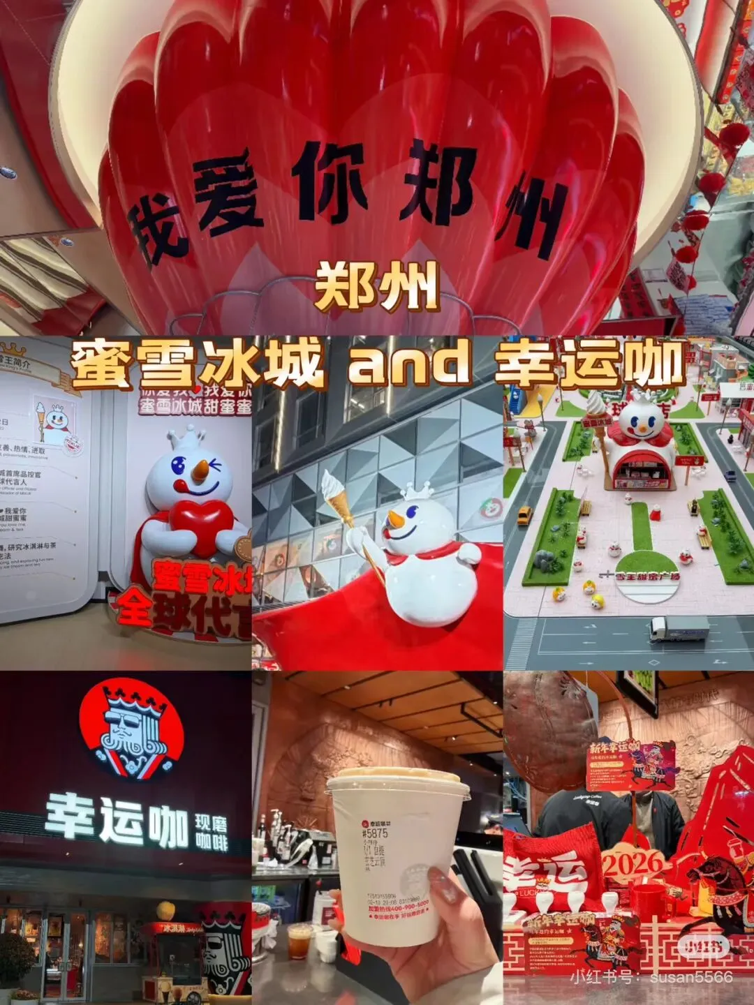 4️⃣蜜雪冰城and幸运咖是一个地方。蜜雪排队人太多了,二楼周边还得在排队,直接放弃。买了一杯郑州限定特调幸运咖,味道还行。