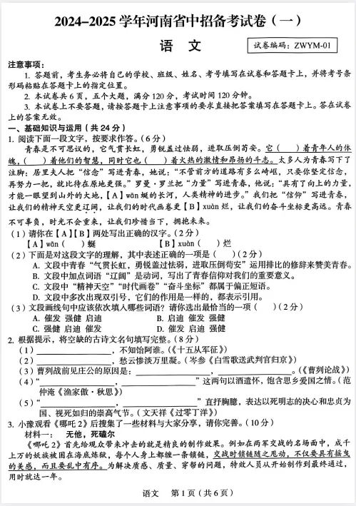 「2025年郑州市外国语中学一模语文试题及参考答案.pdf」
