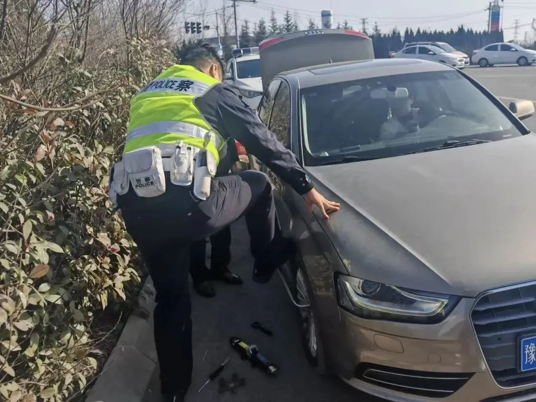 2月20日上午,登封交警五中队马超、蔺炳浩巡逻至S234与G343国道附近转弯路段时,发现一辆小型汽车因右前轮故障停在路边,车主焦急万分、束手无策。