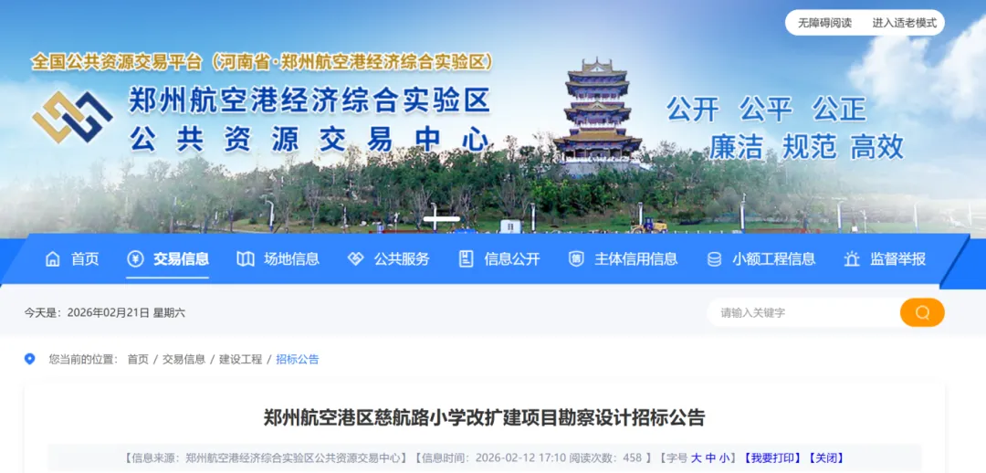 近日,郑州航空港公共资源交易中心发布了《郑州航空港区慈航路小学改扩建项目勘察设计招标公告》。