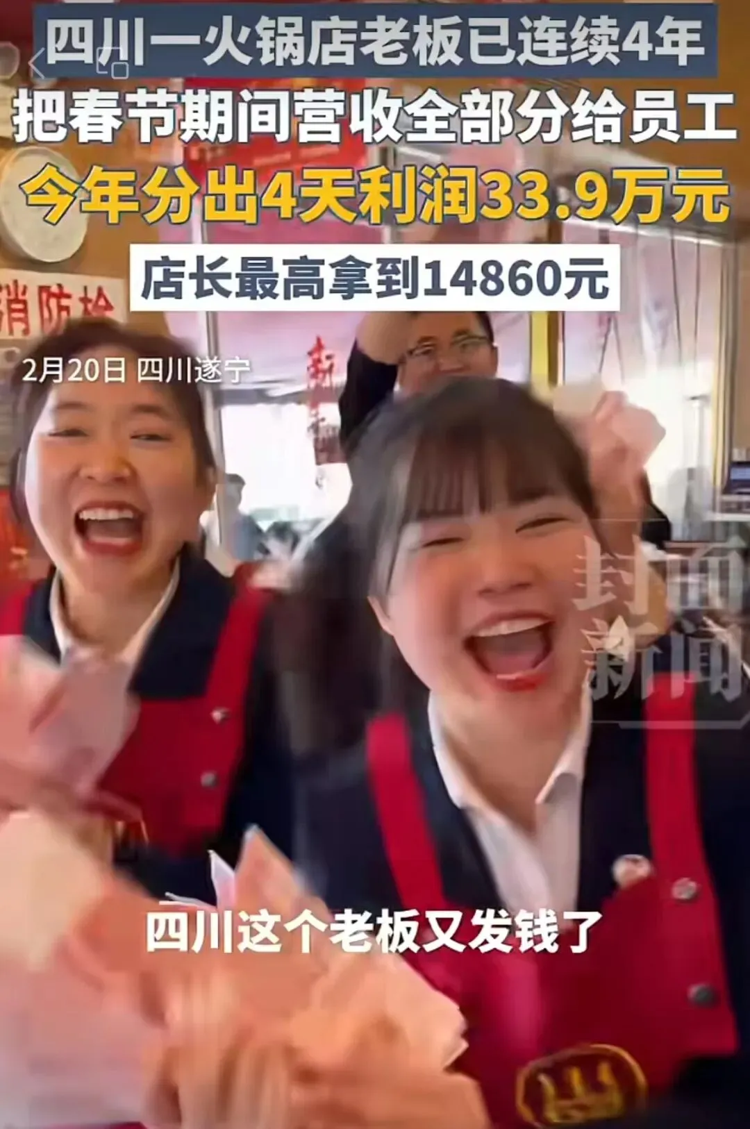 2月20日,农历正月初四,四川遂宁七里川火锅店的员工们,再次领到了一笔沉甸甸的分红:春节前四天的利润33.9万元,老板全部发给大家。店长拿到14860元,服务员最高4865元,保洁岗位也分到了1447元。