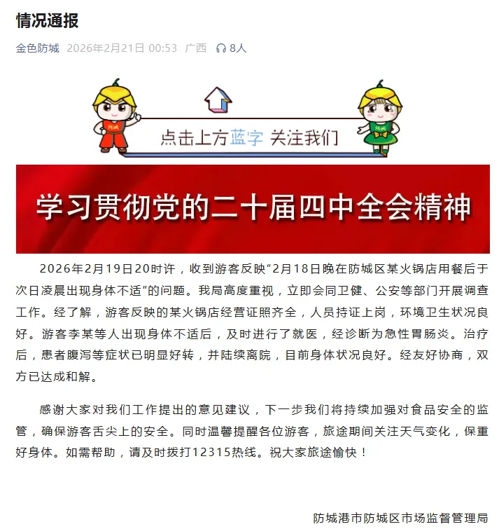 2月19日20时许,收到游客反映“2月18日晚在防城区某火锅店用餐后于次日凌晨出现身体不适”的问题。我局高度重视,立即会同卫健、公安等部门开展调查工作。