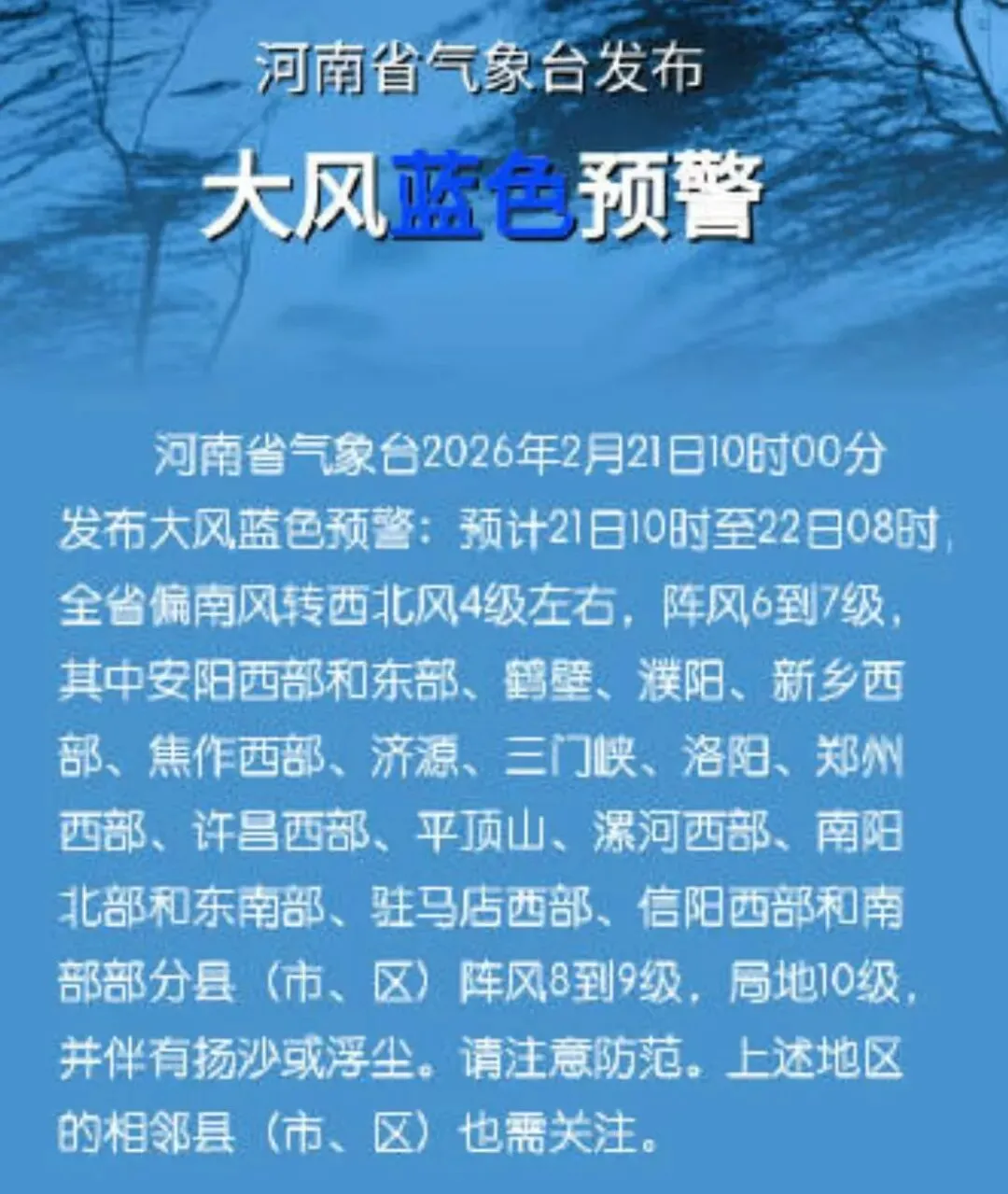 随着冷空气的不断靠近,今明两天河南的大风天气继续,今天上午10时河南省气象台发布大风蓝色预警。↓↓↓