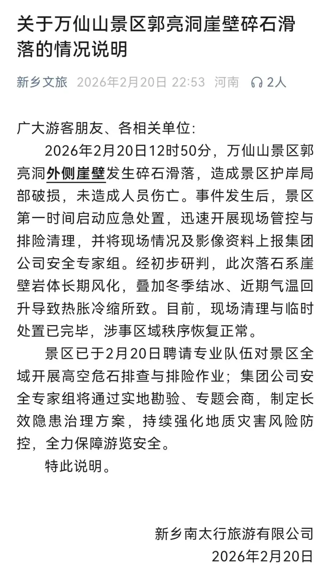 2月20日12时50分,新乡辉县万仙山景区郭亮洞外侧崖壁发生碎石滑落,现场道路一度临时中断,引发游客与市民关注。景区第一时间发布官方情况说明,此次事件无人员伤亡,现场已清理完毕,景区恢复正常开放。