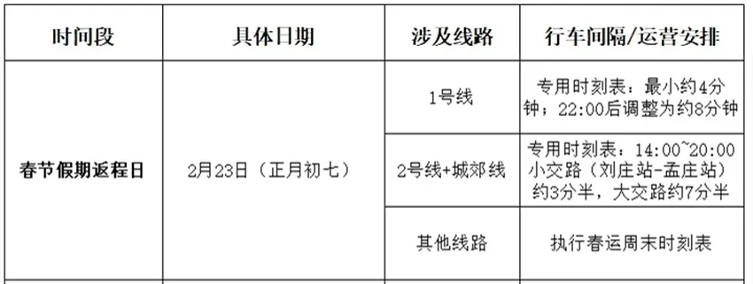 明天是春节假期返程日,郑州地铁1号线最小行车间隔约4分钟,22点后行车间隔调整为约8分钟,2号线与城郊线14点~20点小交路调整为刘庄站至孟庄站,小交路行车间隔约3分半,大交路行车间隔约7分半。