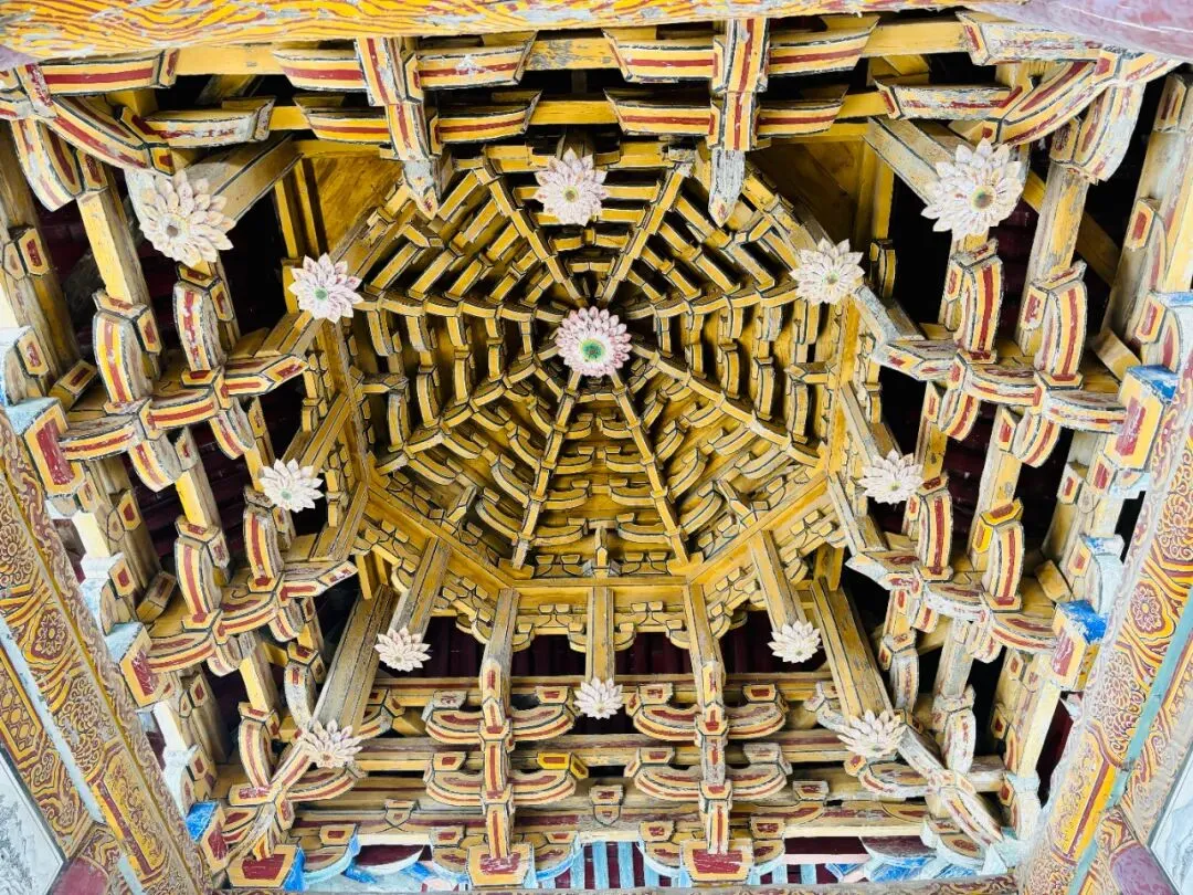 ✅ 莲花头垂花柱藻井:山西现存元代藻井孤例,金代琉璃嵌心,八面莲花绽放,榫卯结构震撼;