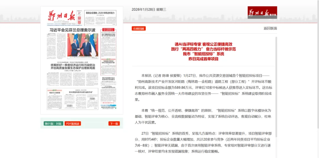 2026年1月27日,郑州市公共资源交易领域首个智能招投标项目——“郑州高新技术产业开发区河阳路(梅林路—金柏路)道路工程(部分工程)”开评标环节顺利完成。