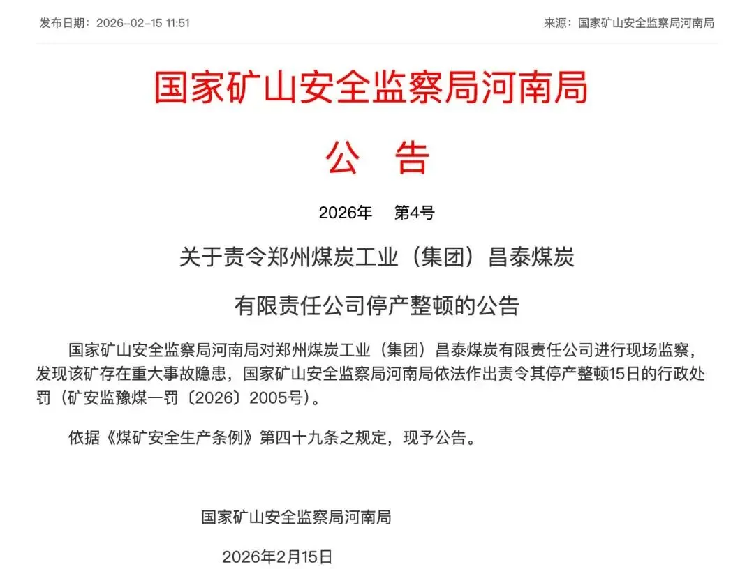 2月15日,国家矿山安全监察局河南局发布公告:执法人员对郑州煤炭工业(集团)昌泰煤炭有限责任公司进行现场监察时,发现该矿存在重大事故隐患,依法作出责令停产整顿15日的行政处罚(矿安监豫煤一罚〔2026〕2005号)。这是今年以来河南煤矿领域因安全隐患受到的最严厉处罚之一,也再次把“煤矿安全”推向公众视野。