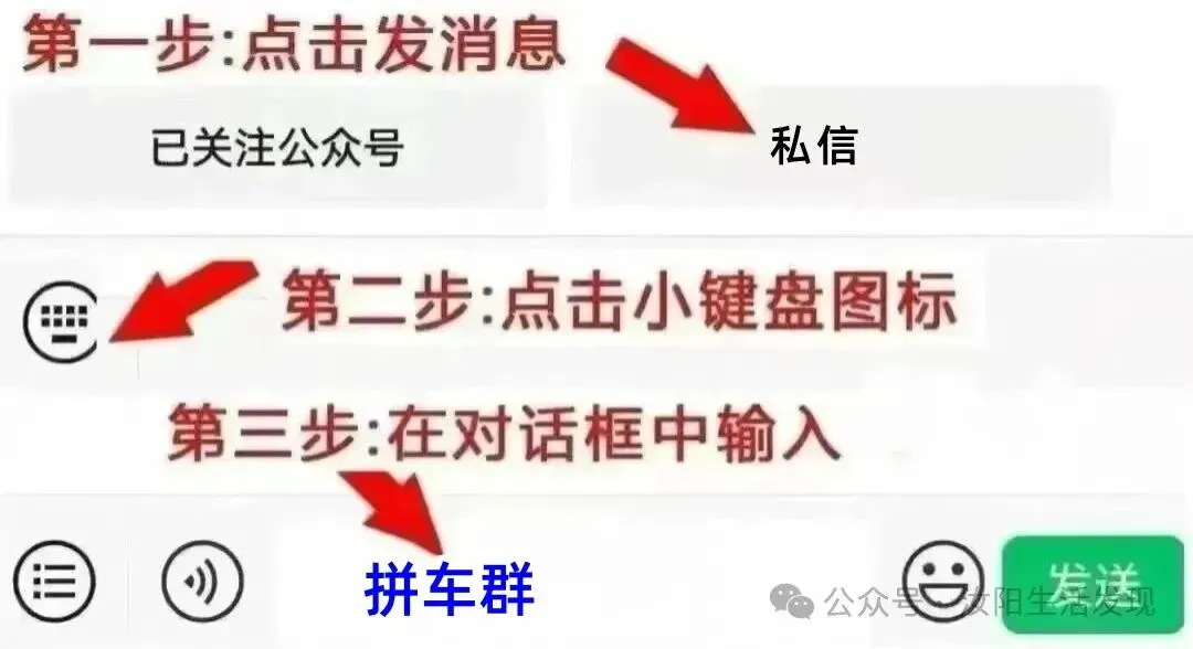 1、关注公众号【汝阳生活发现】或者【汝阳同城】,进入公众号点头像,点私信发“拼车群”,你就会收到最新的群二维码了。这时候扫码直接入群就可以!