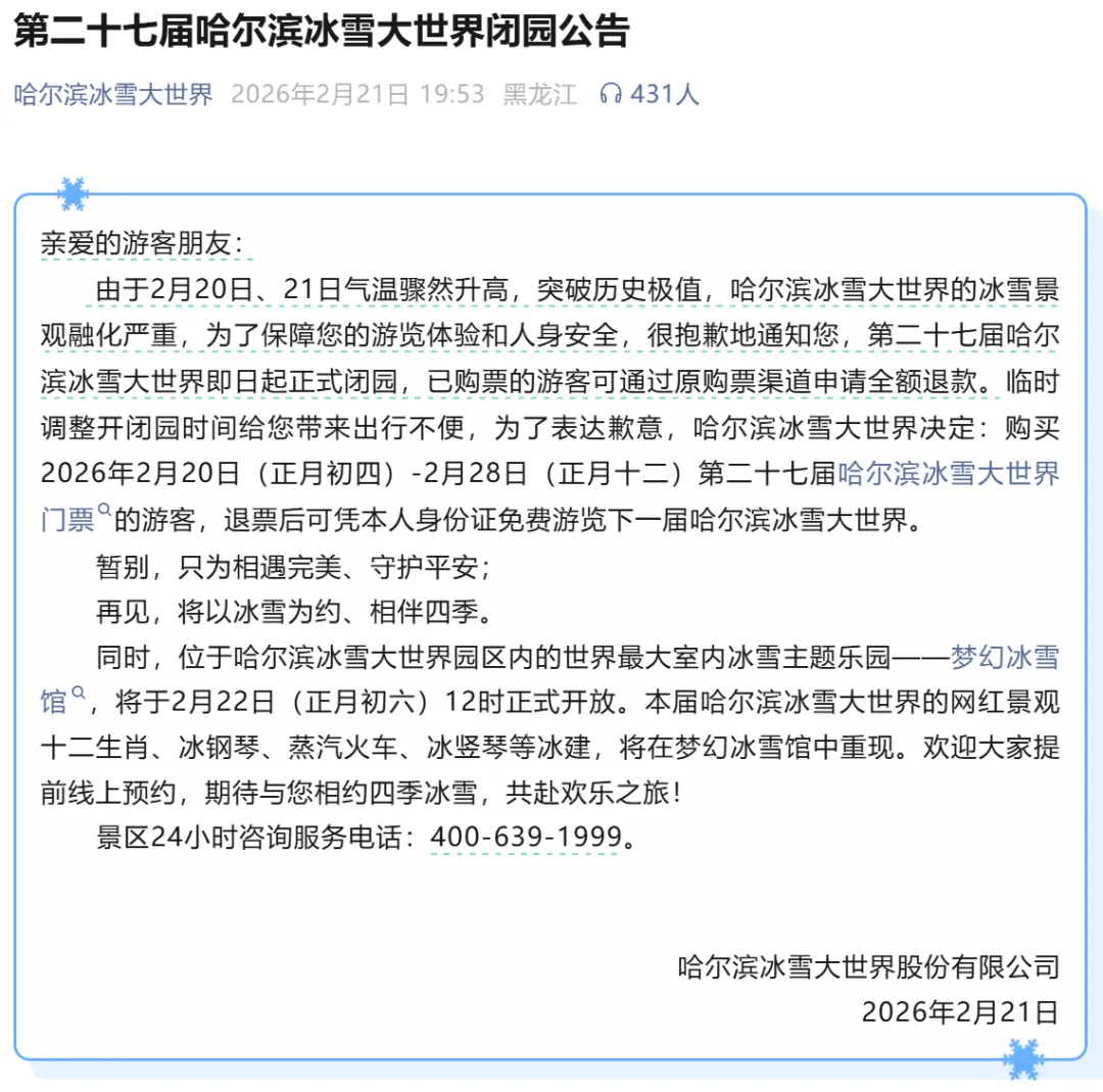 哈尔滨冰雪大世界发布公告:由于2月20日、21日气温骤然升高,突破历史极值,哈尔滨冰雪大世界的冰雪景观融化严重,为了保障游客的游览体验和人身安全,即日起第二十七届哈尔滨冰雪大世界正式闭园,已购票的游客可通过原购票渠道申请全额退款。