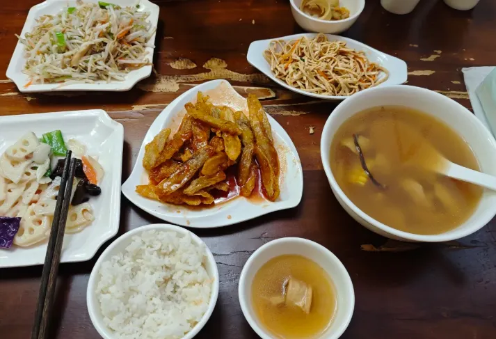 推荐尝尝“少林素斋”。不是那种仿荤的怪味,而是老老实实的豆腐和青菜。尤其是那道红烧豆腐,豆腐做得嫩,过油一烧,外皮焦黄,里面还是雪白的浆汁,咬一口,豆香气直冲鼻腔,清淡里透着股子讲究,汤一喝,人就醒了。