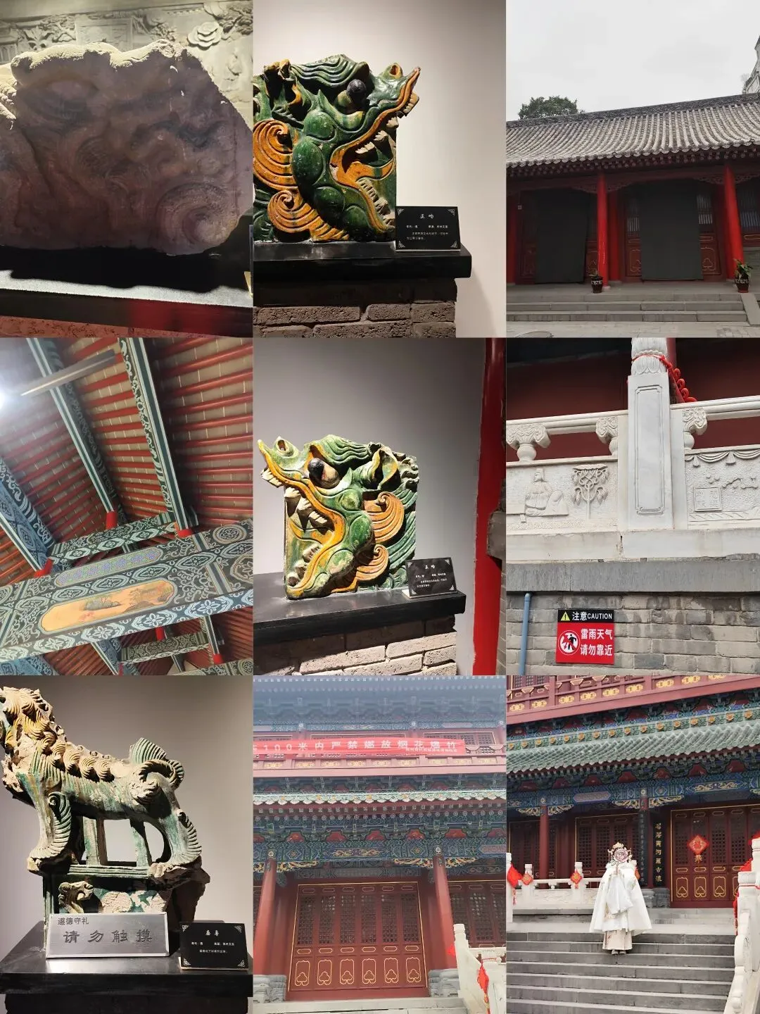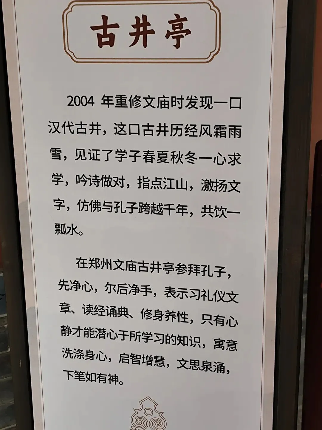女儿充当了导游:“郑州文庙是全国仅次于曲阜孔庙的第二古老文庙!又名郑州孔庙!这座文庙建于东汉永平年间,元代初期占地37亩,由前院、中院和后院组成,包含棂星门、泮池、大成殿等建筑,后因元至正六年(1346年)与清光绪二十二年(1896年)两次大火损毁严重,仅存大成殿和戟门,后多次修缮,大成殿整体抬升1.7米。文庙大成殿被列为第七批全国重点文物保护单位;2021年,获评郑州市首批社会科学普及示范基地 。”