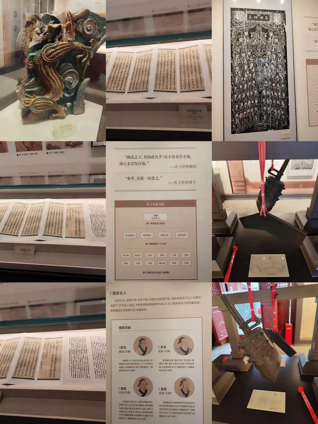 两侧庑房与碑廊,藏着文庙的岁月印记。砖雕《孔子圣迹图》如一部石上连环画,将先师生平娓娓道来;历代修缮碑刻字迹清晰,篆楷行草各有风姿,既是史料,亦是书法。