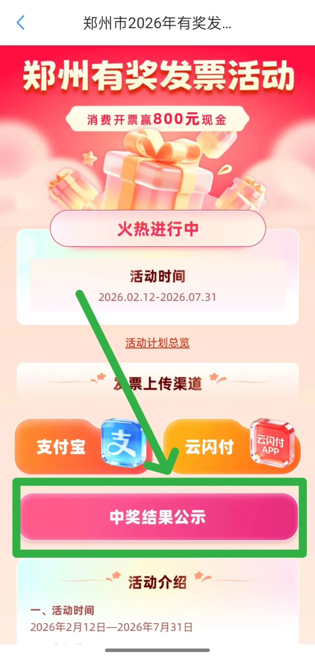 打开“郑好办”APP,点击有奖发票活动入口,点击“中奖结果公示”,即可查看中奖信息。