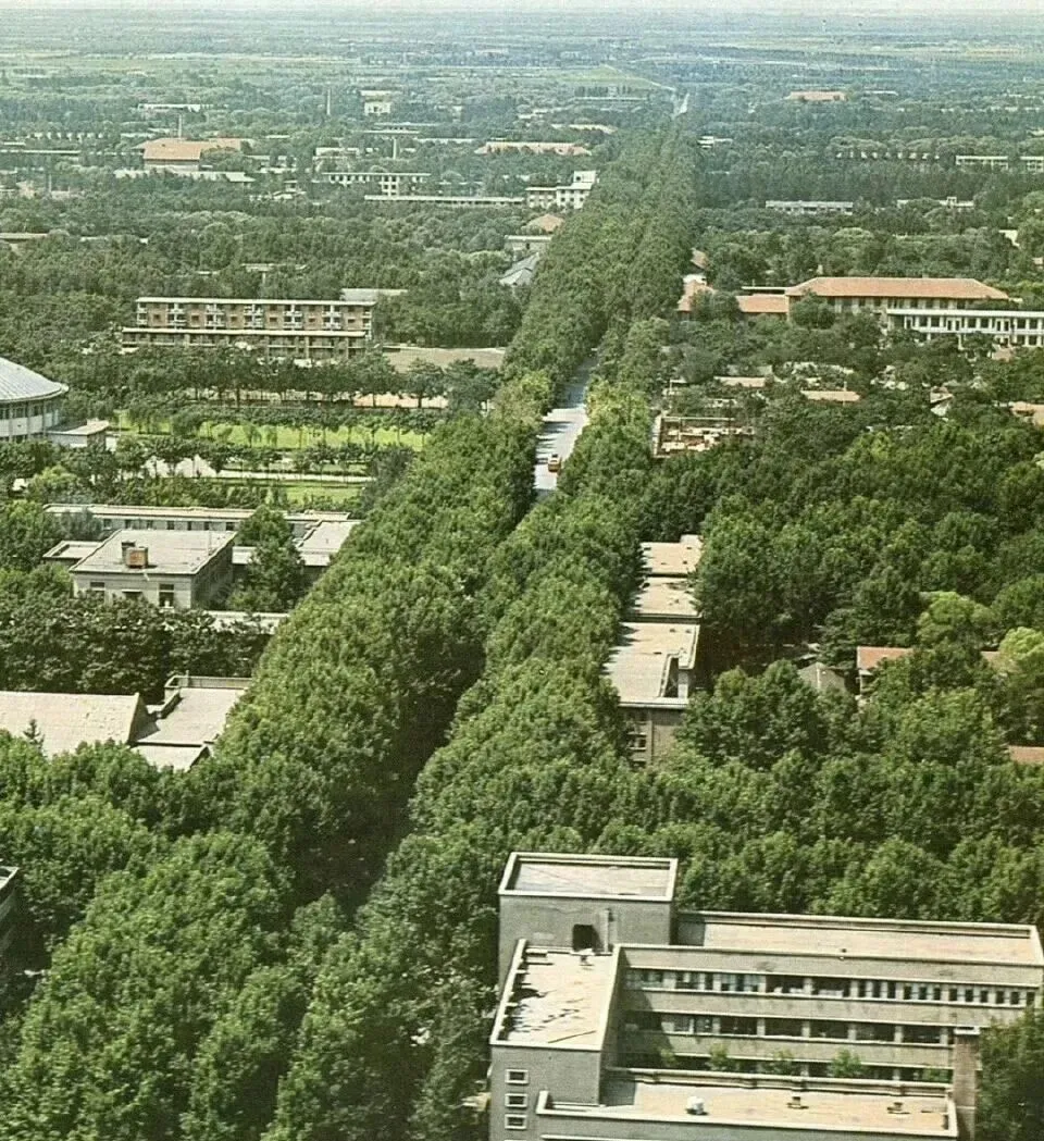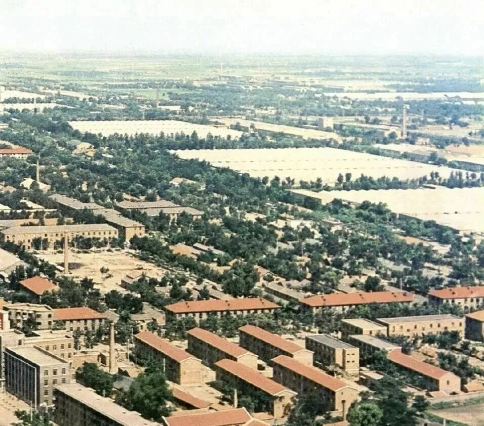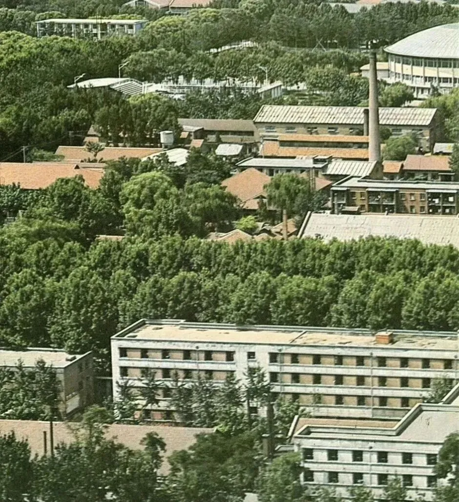 图中这一片红瓦灰墙的院落,叫老工学院区,楼不高,砖混结构扎扎实实,窗棂小而密,烟囱像标尺一样竖着,屋脊一线连一线,远处一层层白色屋面铺开,像被子一样把地盖得严严实实,小时候路过这片儿,只记得风一吹,杨絮顺着巷口打着旋儿进来,满天都是,抖抖肩就掉一片。