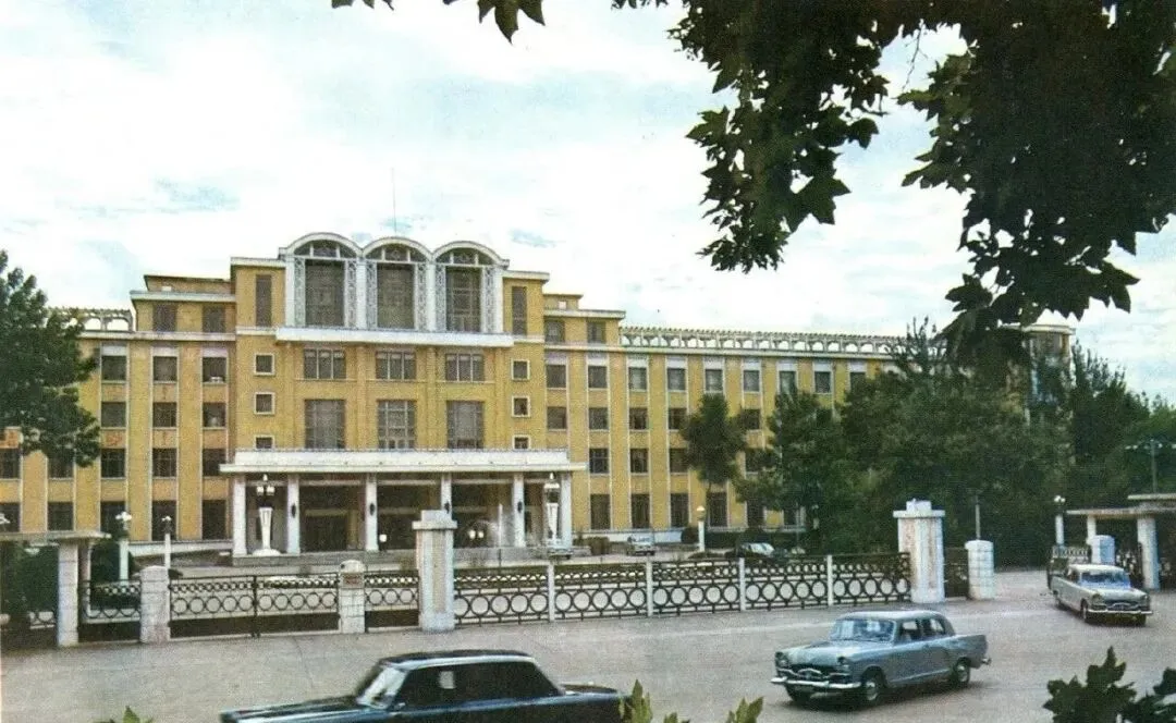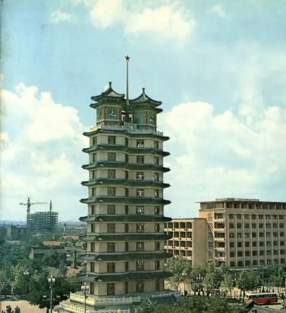 这个黄墙白柱的建筑叫省政府大楼,立柱粗壮,门楼一拱接一拱,栏杆上是圆环花纹,门口常年立着石墩与路灯,老红旗和上海牌轿车慢慢滑过去,节庆日夜里一亮灯,玻璃窗像一格格蜂巢,远看就知道郑州那会儿的庄重是从门脸儿上写出来的。