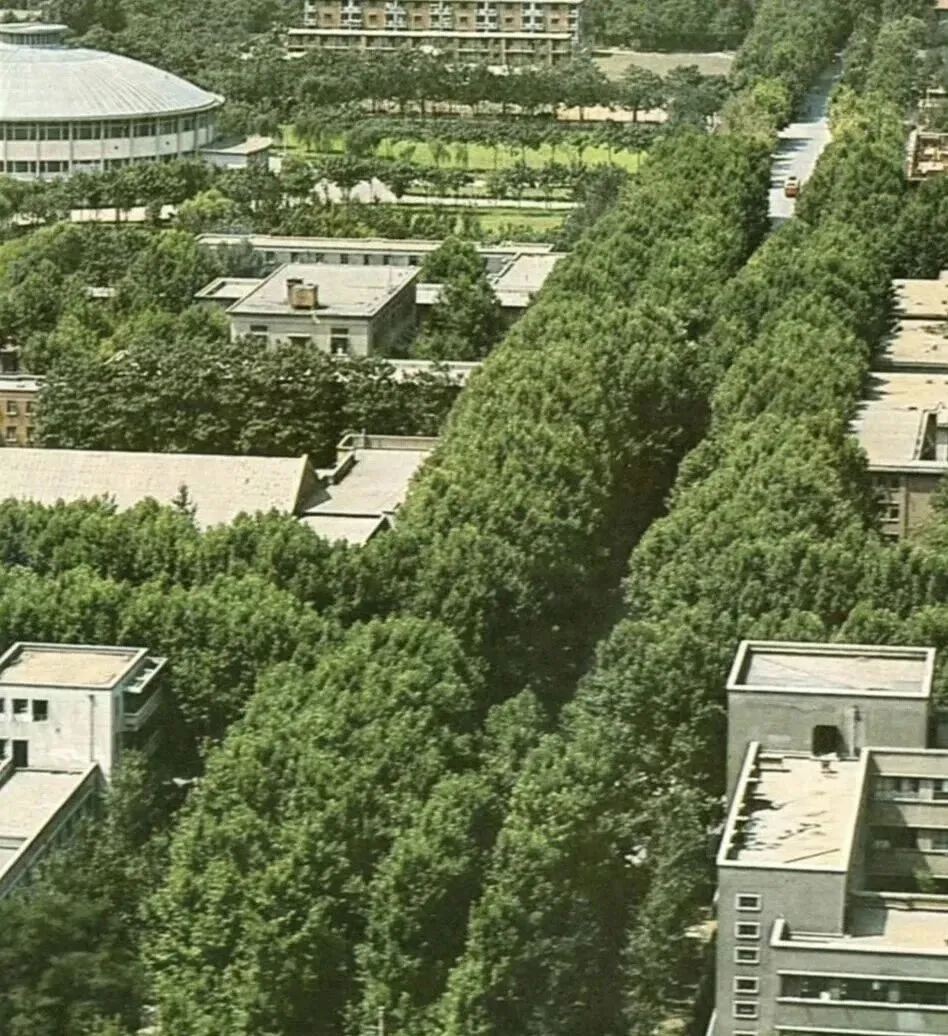这座灰顶大圆盖是工体馆,边上操场草地嫩得发亮,栏栅低低地围着,学生们课间追着跑,哨声一响散成小股风,体育老师夹着小喇叭喊口号,声音从树梢上回回来,踩在渣土跑道上沙沙作响,鞋跟沾着粉,回家得在门口拍半天。