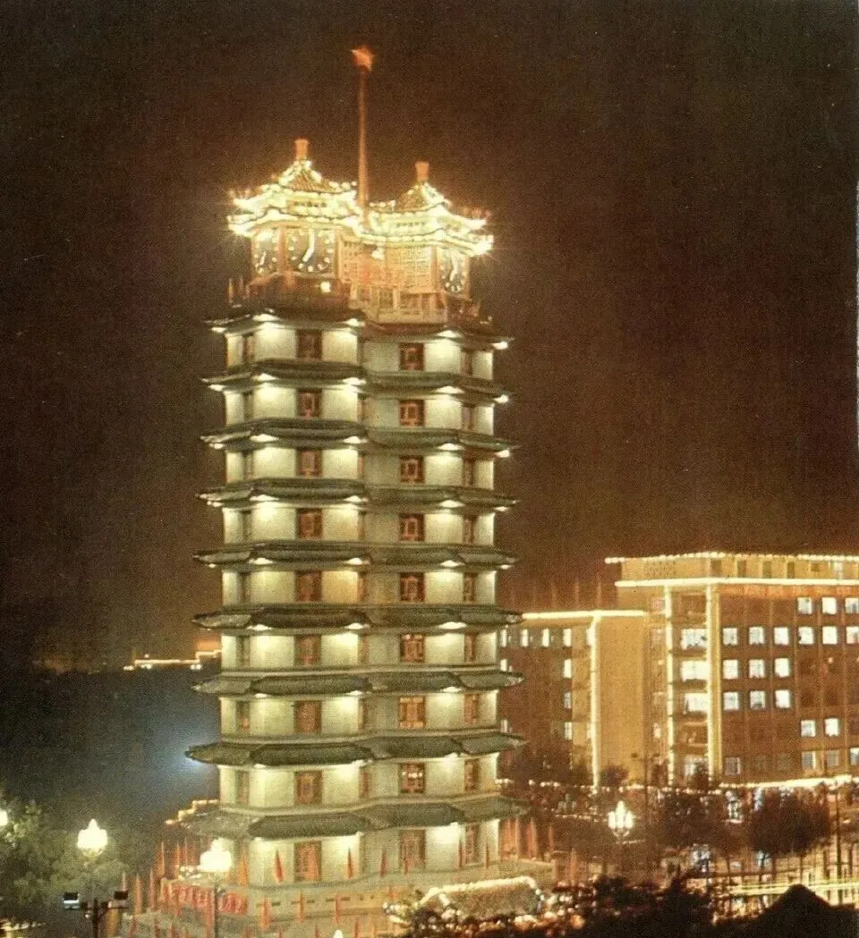 这座亮到发光的宝塔叫绿城塔,层层挑檐往上叠,最顶上旗杆直戳天,灯光把瓦当边沿勾得透亮,风一吹鼓乐悠着来,站在广场边能看到孩子用手指着数层数,我奶奶那会儿爱说,塔一亮,心就亮,回家路都好走了。