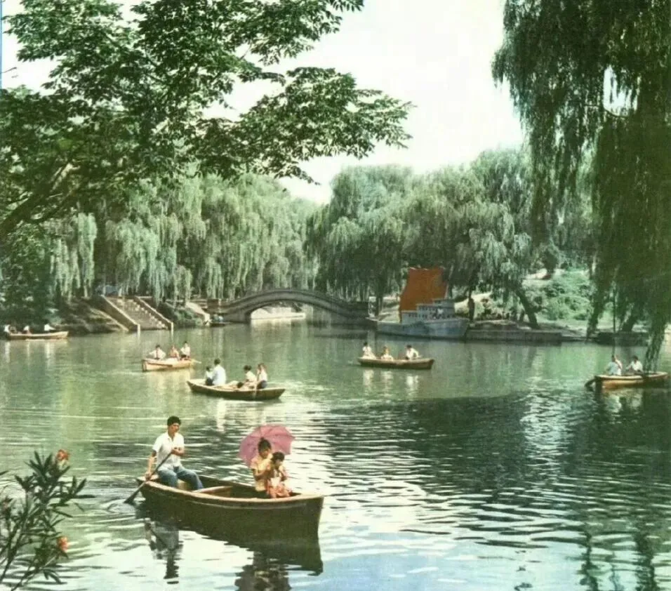 这个湖面是人民公园的南湖,木船身子厚,桨叶一下一下切开水,水纹像鱼鳞追着船头跑,柳条从肩头拂过去痒痒的,小卖部一角红汽水冻得打牙颤,爸爸会把瓶盖往裤腰上一卡,铛地一声就开了,阳光在玻璃上跳舞,甜到心里头。