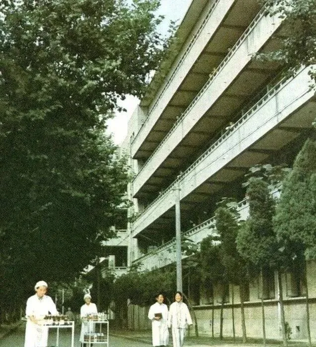 这处长长的外廊是老医院的病房楼,水泥护栏波浪样起伏,楼影把地面切成一块一块,护士推着药车,玻璃瓶在金属板上叮当作响,爷爷住院那回,我提着搪瓷缸去打开水,壶嘴冒着白汽,墙角贴着手写的三行字,保持安静四个字最醒目。