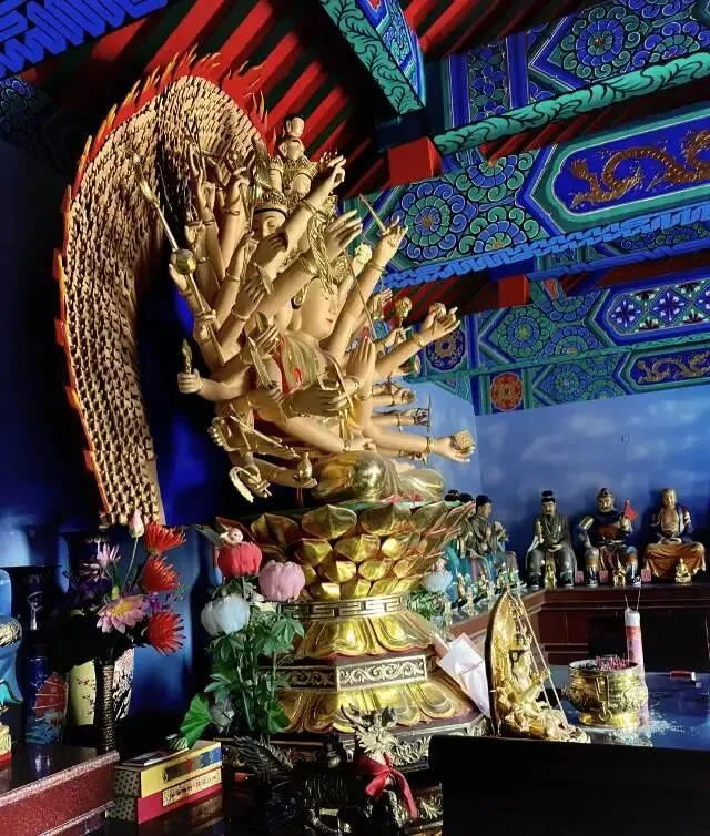 真正让我顿悟的,是大雄宝殿里的千手观音。每一只手都摆出不同的手势,或施无畏印,或持如意法器,没有凌厉,没有疏离,每一个姿态都像在轻轻抚摸世人的伤口,抚慰心底的焦虑与不安。盯着菩萨慈悲的面容,《心经》里的句子自然而然浮现在脑海:色不异空,空不异色,色即是空,空即是色。