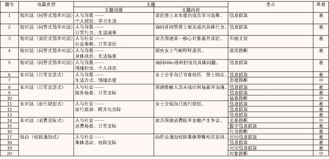 分析说明:听力的考查点为教材课堂听力训练的基础考点,无复杂推断、深层理解要求,贴合高一必修阶段的听力能力要求,学生在教材学习中积累的听力技巧(如抓关键词、听语气)可直接迁移作答。