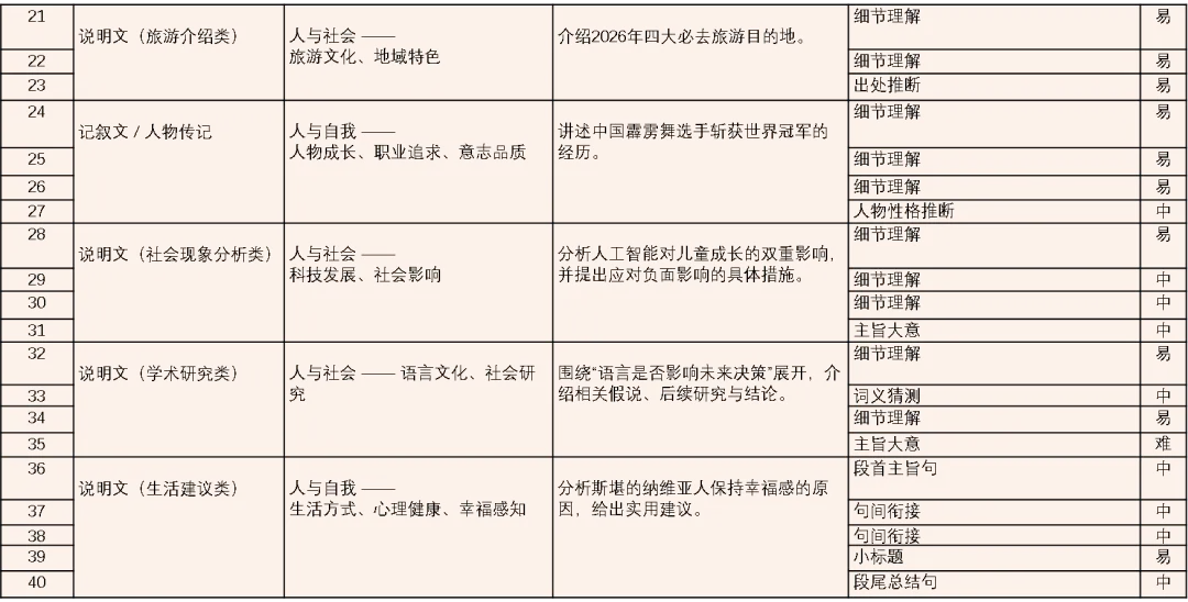 分析说明:语法填空的考点不超纲,贴合教材必修阶段语法教学重点,基础知识点直接考查教材原短语、原用法,稍难考点仅对先行词、语境进行小幅拓展,学生只要掌握教材基础语法,即可准确作答。
