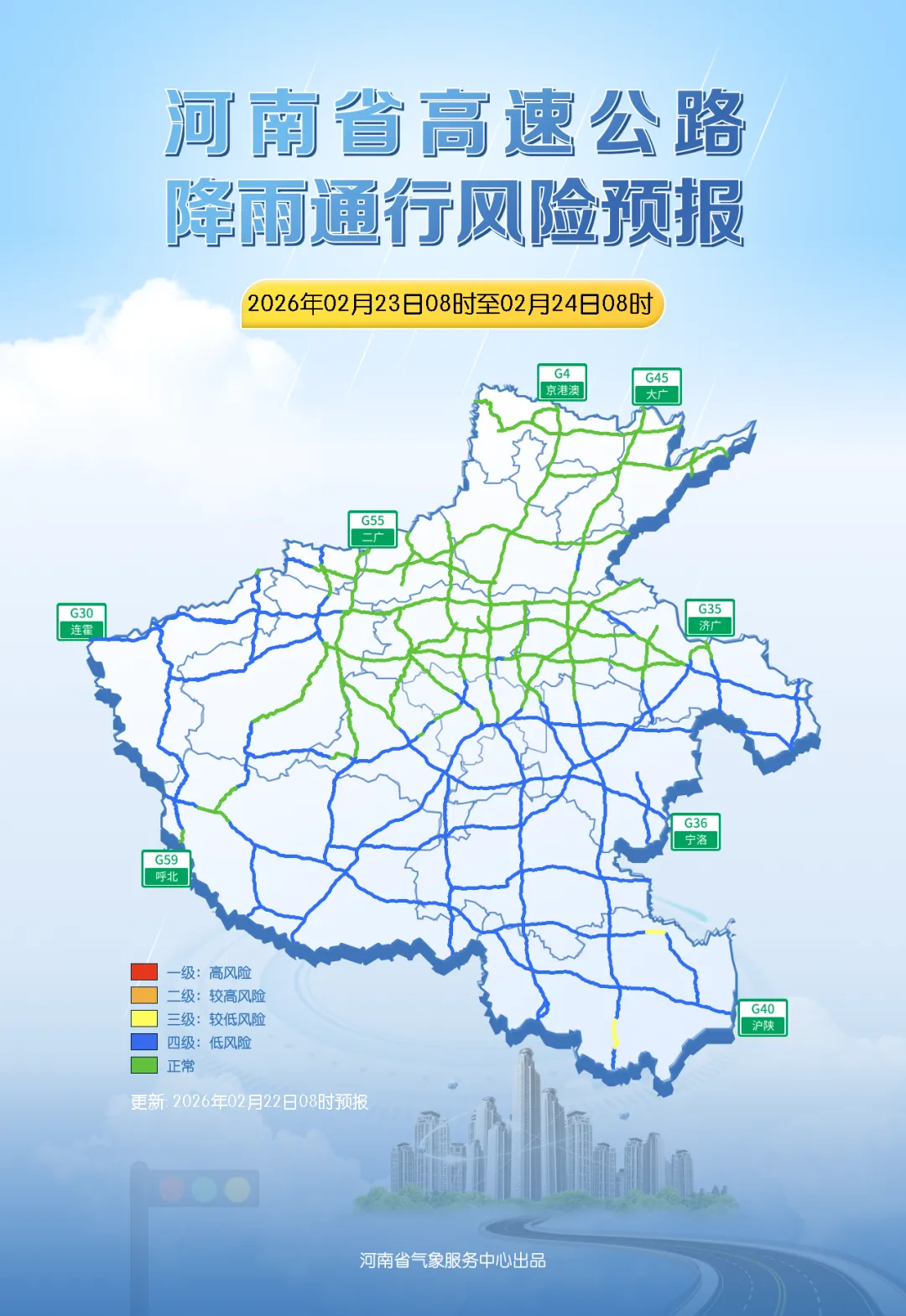 返程提示:返程的朋友,提前关注路况!豫东、豫南地区雨大,开车放慢车速、避开积水;豫西、豫北山区注意道路结冰,非必要不前往山区。
