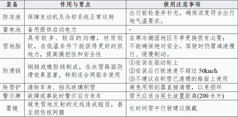 根据车辆状况、行驶路线准备冰雪天气行车装备,提前获取实时天气预报与路况预警,非必要避免在暴雪或道路结冰时段出行。