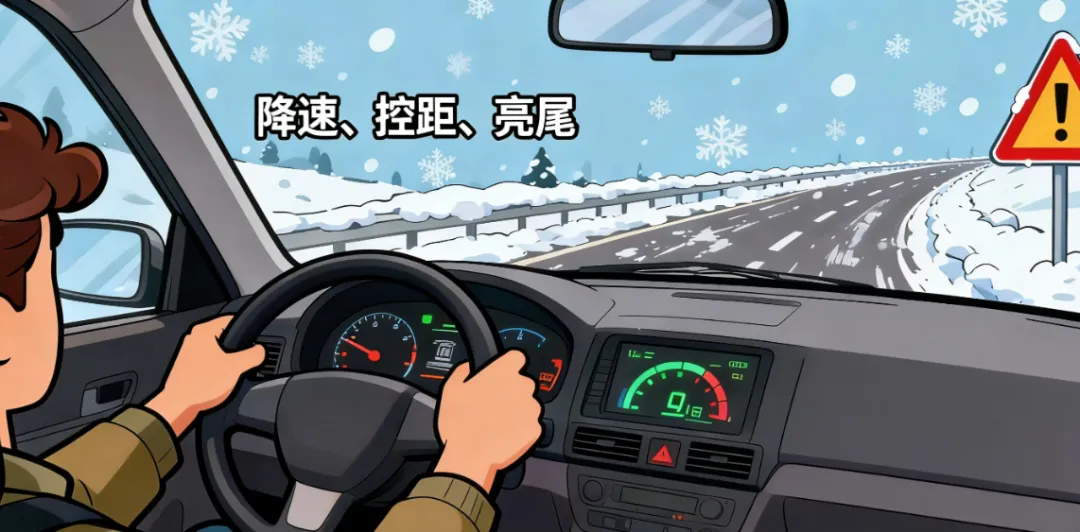雪天能见度差时,及时开启前后雾灯、近光灯,能见度持续降低可开启危险报警闪光灯;雪后晴天或能见度转好时,需关闭雾灯避免眩目。切记禁用远光灯,其散射光在雪天易形成 “光幕”,严重影响视线判断。