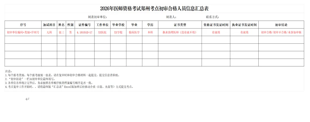 ②所有初审通过考生,请按考点反馈考生信息制作规定模板格式,汇总为《2026年医师资格考试郑州考点初审合格人员信息汇总表》(以下简称“汇总表”)(见附件3)。“汇总表”不得有空项,电子版和纸质版均作为考点复审重要依据。